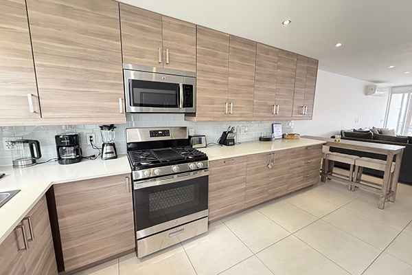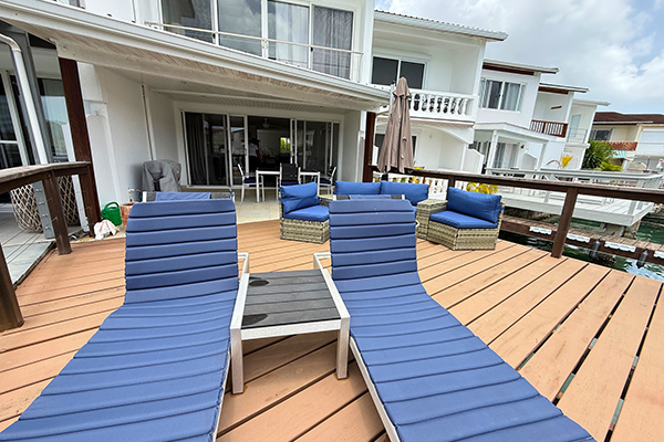 Large glass sliding doors in the living room open to a waterfront deck, complete with dining for four, two lounge chairs, and a barbecue grill — perfect for outdoor dining or simply relaxing by the water. The villa is equipped with modern amenities, including a dishwasher and washer/dryer for your convenience and a private driveway for easy access.