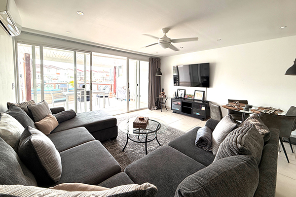 The second bedroom, furnished with a queen-size bed and a single bed, also has an en' suite bathroom and its own private balcony with a table and two chairs — ideal for enjoying the tranquil atmosphere. Downstairs, the open-concept living area features a fully equipped kitchen that flows into the dining room and spacious living room.
