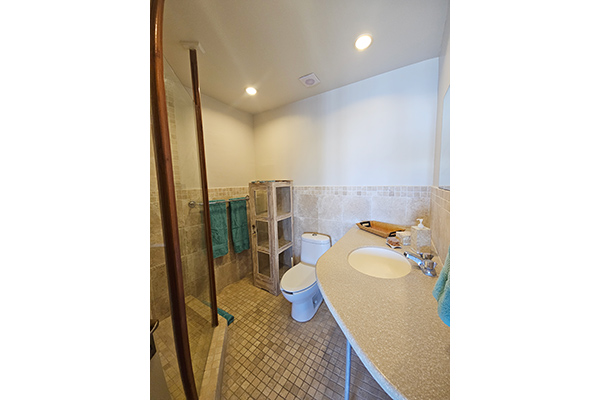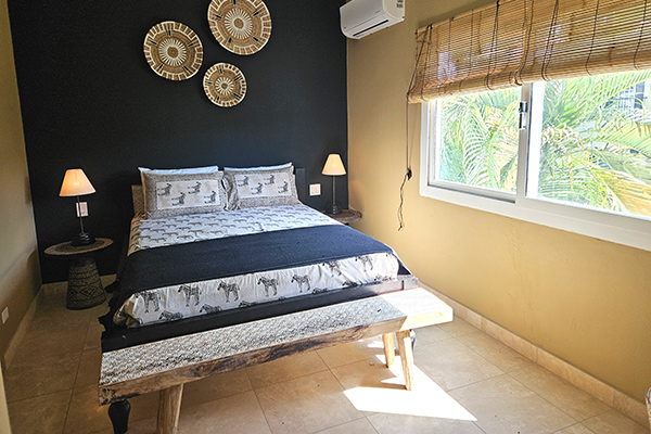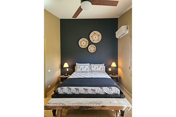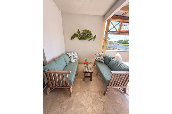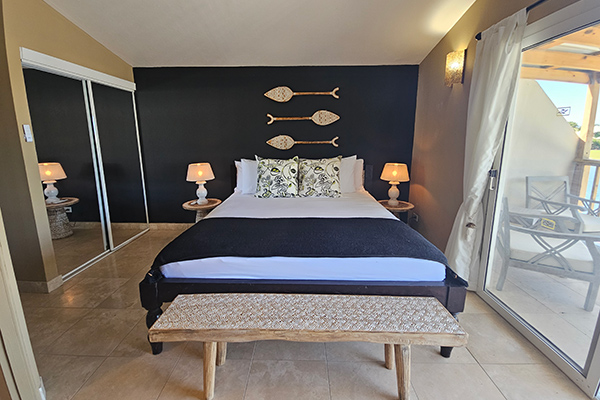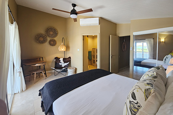 The king master suite is spacious and serene, offering its own private upstairs patio overlooking the harbour and surrounding mountains — an absolutely breathtaking setting for morning coffee or sunset drinks. Like the queen room, it is fully air-conditioned and equipped with ceiling fans for added comfort.