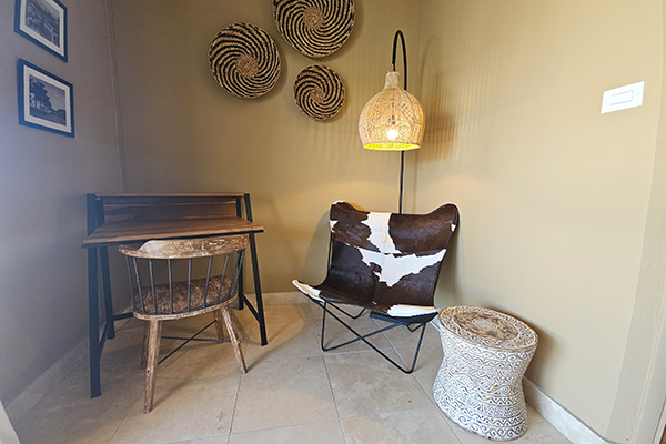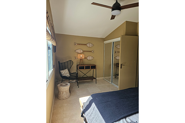 Upstairs, two beautifully appointed en-suite bedrooms await. The queen bedroom is fully air-conditioned and features ceiling fans, ample storage, and a charming desk nook with chair — ideal for catching up on emails or enjoying a quiet moment.