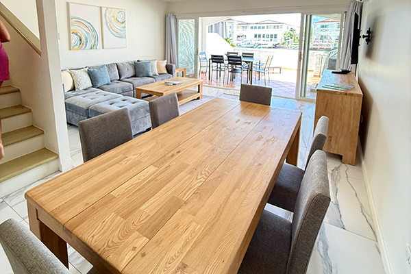 The open-concept layout flows seamlessly into the dining area, featuring a handsome wooden table with seating for six. And, then into the inviting living room, adorned with a cozy sectional sofa, a large smart TV and complimentary Wi-Fi.