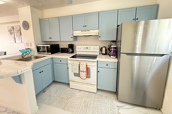 Upon arriving, you’ll find a dedicated parking spot just steps from the front door. Inside, the main level greets you with a fully equipped kitchen—complete with a stove, fridge, microwave, blender, kettle and a full array of cookware and utensils—plus a washer and dryer conveniently off to the side. A half bath is also located on this floor.