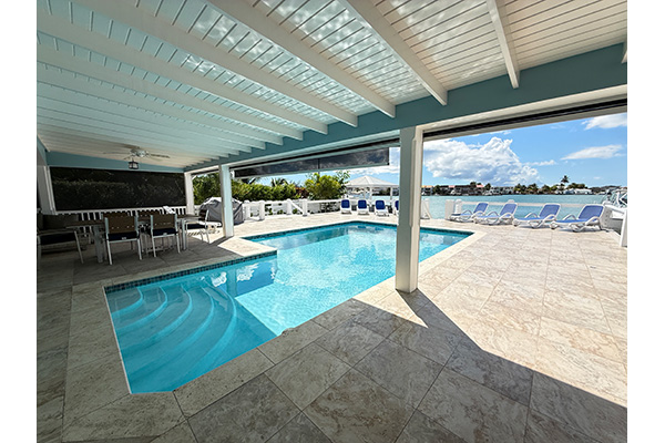 Expansive glass doors that open out to the pool deck, allowing natural light and waterfront breezes to fill the space.