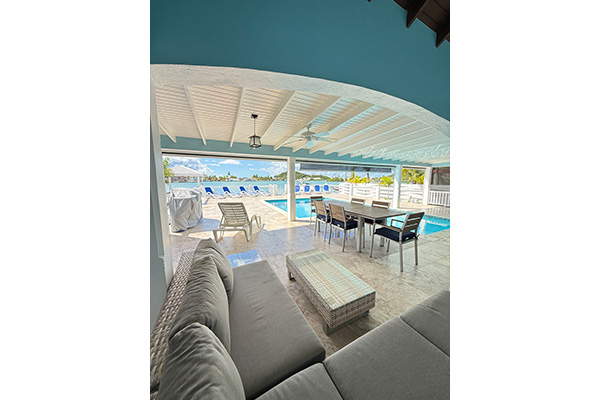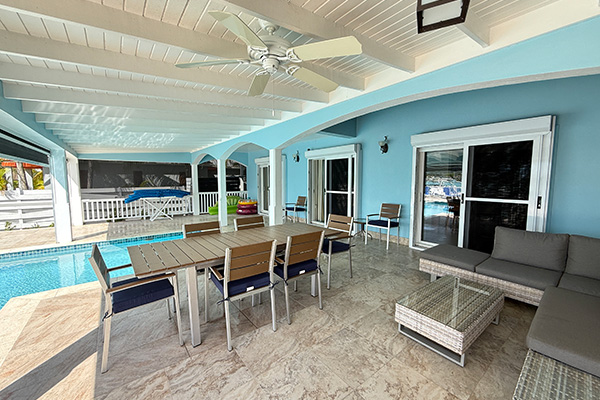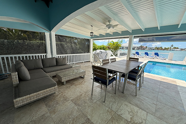 A covered lounge and dining area, ideal for alfresco meals or evening cocktails.