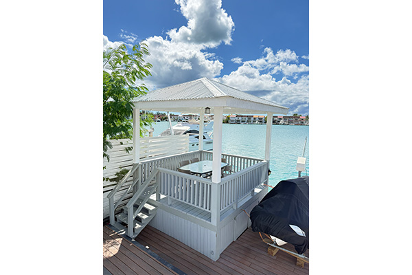 A gazebo perched on the water's edge with table and chairs to enjoy those al-fresco meals.