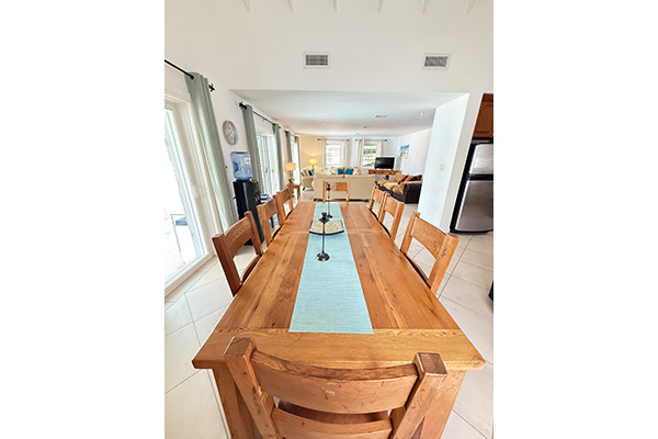 A large, open-concept living area that flows effortlessly into the dining room and a fully equipped kitchen.